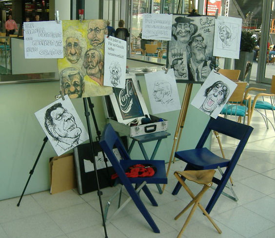 Bei Messen, Austellungen und Werbeveranstaltungen bildet er den Mittelpunkt des turbulenten Geschehens und sorgt für eine aktionsgeladene Stimmung. Dabei schießt er aber nie über das Ziel hinaus. Eine ideale Verbindung von Erlebnis und Geschenk. Er zeichnet an der Staffelei, oder als Walking Act Mobil bei den Gästen am Tisch.