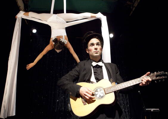 wird von Lucky Loop zum Leben erweckt und zu akrobatischen Höhenflügen verleitet. Mit Musik dirigiert er Marionettas Spiel, lässt sie unglaubliche Verrenkungen vollführen und schliesslich an schneeweissen Tüchern scheinbar schwerelos in die Lüfte steigen.
