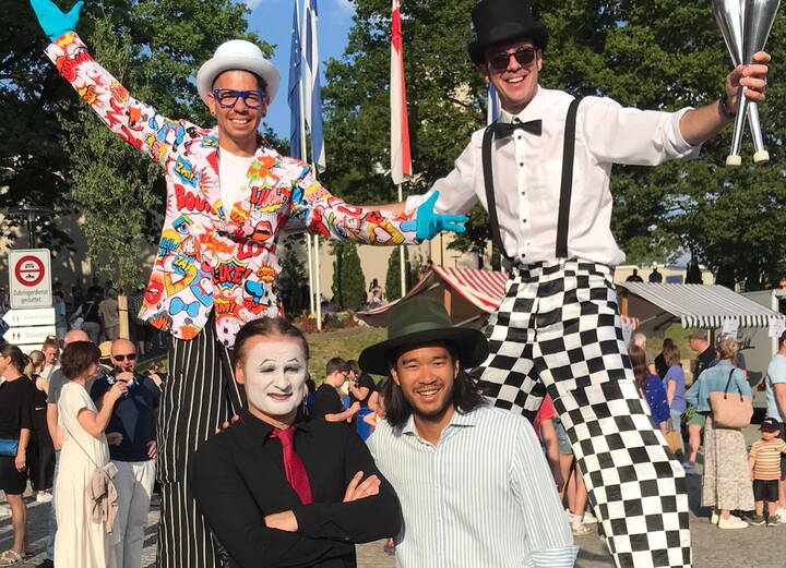 2 Stelzen, Pierre und Marc,  1 Pantomime Frank, 1 Zauberer Shori an einem Stadtfest